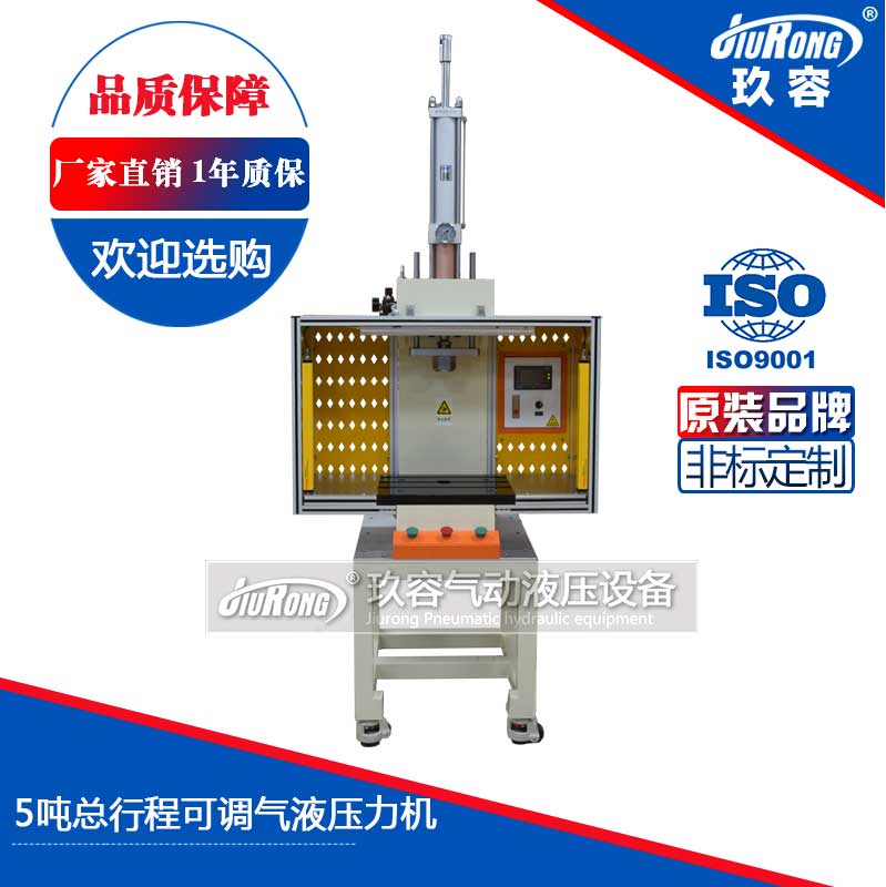 5T總行程可調氣液增壓機為非標定制設備,5噸出力的氣液壓力機產品。產品最大的特點是:總行程可調。設備采用JRC總行程可調氣液增壓缸作為氣動執行元件,采用PLC控制,方便操作簡單方便舒適,可搭配1t、3t、5t、8t、10t氣液增壓缸使用。